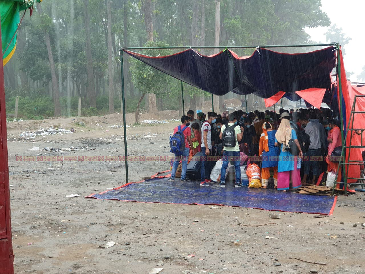 <p>कैलाली । आज बिहानैदेखि हुवाहुरीका साथ पानी परिरहेका कारण भारतबाट स्वदेश फर्किरहेका नेपालीले कैलालीको त्रिनगर नाकामा सास्ती खेप्नु परिरहेको छ ।</p>