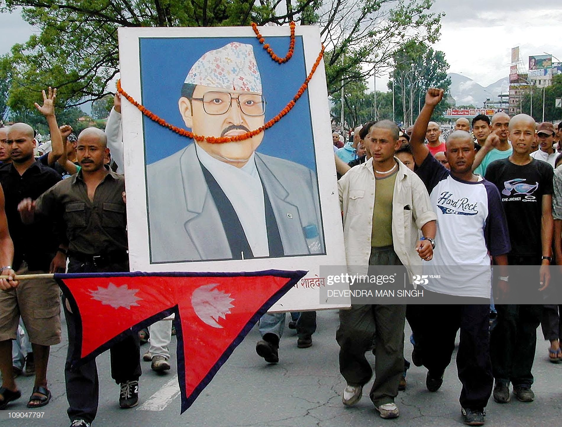 <figcaption class="caption-line">राजा ज्ञानेन्द्रको गद्दीआरोहणको विरोध गर्दै कपाल मुण्डन गरेका युवाहरू राजा वीरेन्द्रको तस्वीर लिएर प्रदर्शनमा। तस्वीर: देवेन्द्रमान सिंह/गेट्टी इमेज</figcaption>