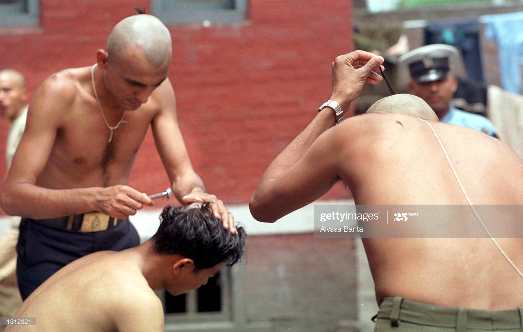 <figcaption class="caption-line">मृतक राजपरिवारप्रति श्रद्धा जनाउँदै केश मुण्डन गर्दै प्रहरीहरू। तस्वीर: एलिस्सा बन्ता/गेट्टी इमेज।</figcaption>