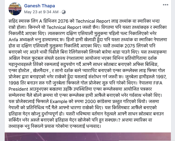 ९ जेठमा एन्फाले ‘टेक्निकल ह्याण्डबुक’ सार्वजनिक गरेपछि गणेश थापाले त्यसमा धेरै त्रुटि रहेको भन्दै फेसबुकमा लामो स्ट्याटस लेखे। उनले एन्फाले सार्वजनिक गरेको ‘टेक्निकल ह्याण्डबुक’लाई प्राविधिक प्रतिवेदनभन्दा ‘तथ्याङ्क वा स्मारिका’ भन्दा फरक नपर्ने बताए।