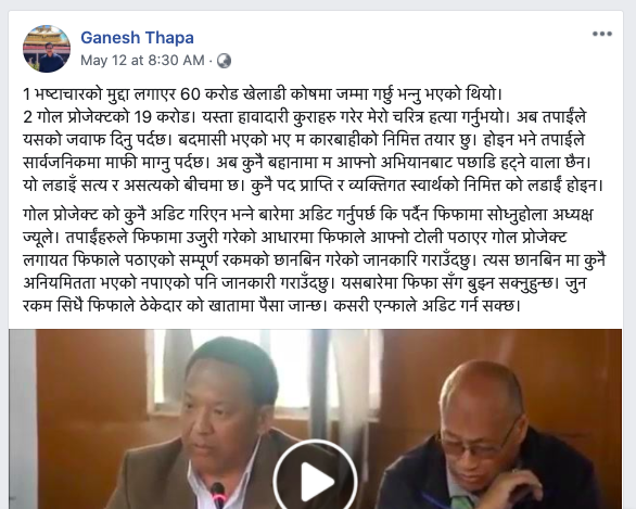 ‘दर्शक महानुभावहरूले तिरेको रकम सदुपयोग गर्दै आफ्नै साधन स्रोतबाट बनाएको अफिस बिल्डिङ, एन्फा होस्टेल, खेलमैदान र सानो दर्शक बस्ने प्यारापिट बनाएको एन्फा कम्प्लेक्सलाइ फिफा गोल प्रोजेक्टद्वारा बनाइएको भनेर राखेको हुँदा यसलाई संशोधन गर्न जरूरी छ’, एन्फा कम्लेक्सबारे उक्त प्रतिवेदनमा राखिएको तथ्य गलत भएको भन्दै थापाले लेखेका छन्, ‘१९९७/९८ तिर बनाउन शुरू गर्दा फिफाको गोल प्रोजेक्ट शुरू भएको पनि थिएन। नेपालमा फिफा अध्यक्ष आउनुभएका बखतमा उहाँकै उपस्थितिमा एन्फा कम्प्लेक्समा आयोजित पत्रकार सम्मेलनमा मैले बोल्ने क्रममा यो एन्फा कम्प्लेक्स हामी आफैंले बनाएको भनेर गर्वसाथ भनेको थिएँ। यस प्रोजेक्टलाई फिफाले उदाहरणको रूपमा २००० को कंग्रेसमा प्रस्तुत गरिएको थियो। जसमा नेपालको प्रतिनिधित्व गर्दै मैले आफ्नो धारणा राखेको थिएँ। यस किसिमबाट आफैंले बनाएको इतिहास मेट्न खोज्नु दुर्भाग्यपूर्ण हो। यसरी भविष्यमा वर्तमान नेतृत्वले आफ्नै साधन स्रोतबाट बनाउन सकिँदैन भनेर अरूले बनाएको इतिहास मेट्न खोजेको पनि हुन सक्दछ।’