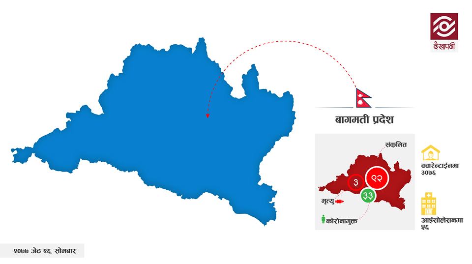र, बागमती प्रदेशमा सबैभन्दा कम ९२ जना संक्रमित भएकोमा ३३ जना कोरोनामुक्त भएका छन् भने तीन जनाको मृत्यु भइसकेको छ। बागमती प्रदेशको रसुवा जिल्लामा संक्रमण देखिएको छैन।