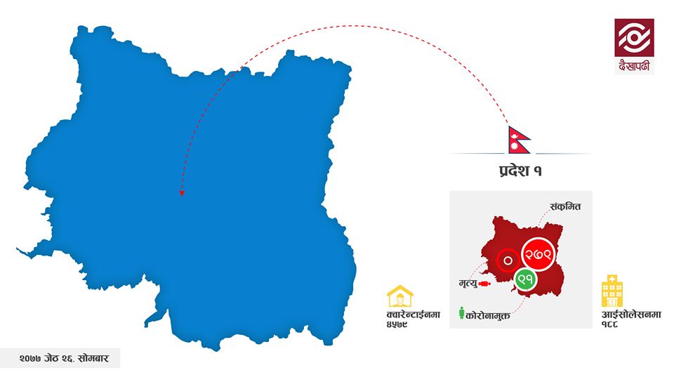 यसैगरी, प्रदेश १ मा २७९ जनामा संक्रमण पुष्टि भएकोमा ९१ जना कोरोनामुक्त भएका छन्। प्रदेश १ मा इलाम र ओखलढुंगा कोरोना संक्रमणबाट सुरक्षित छन्।