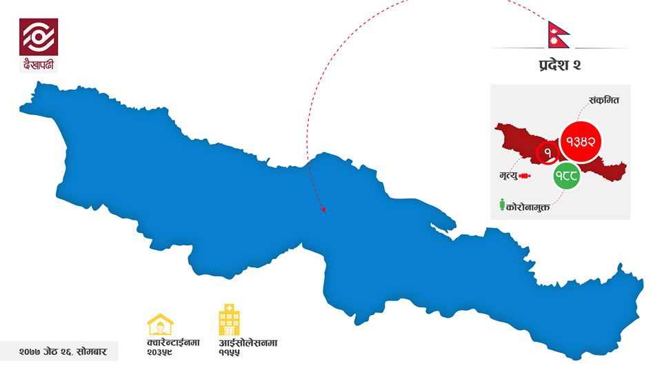 स्वास्थ्य तथा जनसंख्या मन्त्रालयका प्रवक्ता डा. जागेश्वर गौतमका अनुसार सबैभन्दा धेरै प्रदेश २ मा एक ३४२ संक्रमित भेटिँदा १८८ जना कारोनामुक्त भएका छन्। एक जनाको मृत्यु भएको छ। प्रदेश २ मा आज मात्रै १७४ संक्रमित थपिए।