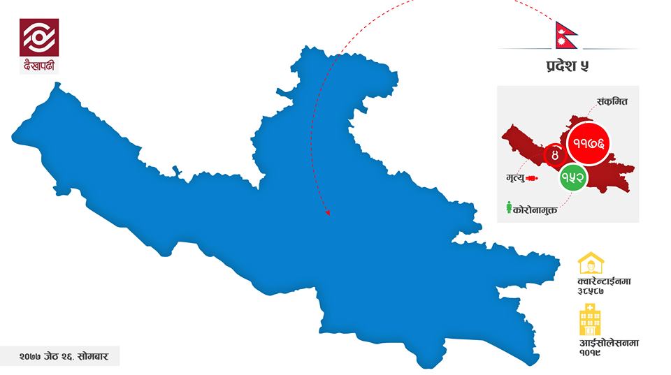 त्यसपछि सबैभन्दा धेरै प्रदेश ५ मा एक हजार १७६ संक्रमित भएका छन्। प्रदेश ५ का सबै, १२ वटै जिल्लामा संक्रमित भेटिएका छन्।