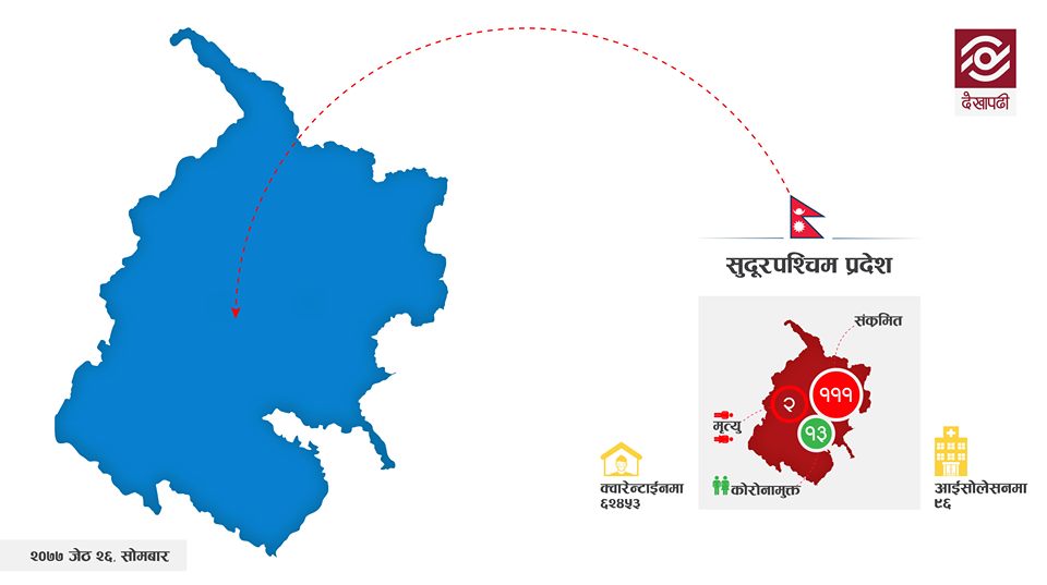 सुदूरपश्चिम प्रदेशमा १११ संक्रमित मेटिँदा १३ जना कोरोनामुक्त भएका छन्। दुई जनाको मृत्यु भएको छ। सुदूरपश्चिम प्रदेशका नौवटै जिल्लामा संक्रमण देखिएको छ।