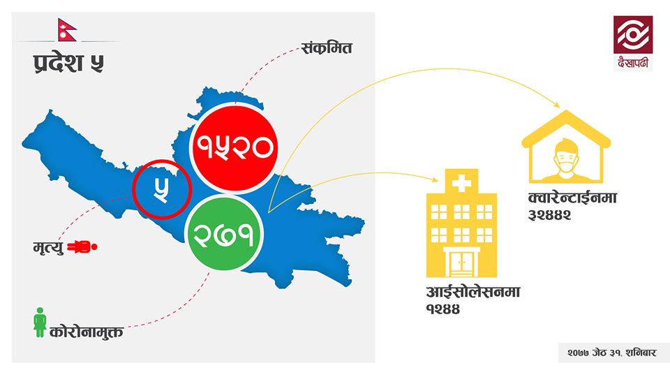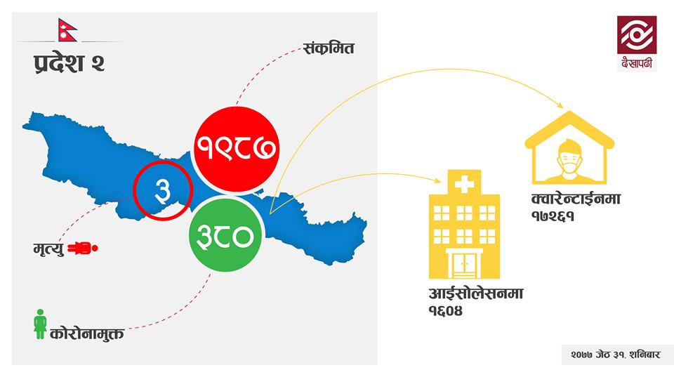 यस्तै, कर्णाली प्रदेशका सुर्खेतमा ४० र दैलेखका ३० जनामा संक्रमण पुष्टि भएको छ। योबाहेक पछिल्लो २४ घण्टामा झापाका पाँच, मोरङका चार, पर्साका ६, बाराका एक, पर्वतका चार, नवलपरासी पश्चिमका एकजनाका संक्रमण पुष्टि भएको छ।
