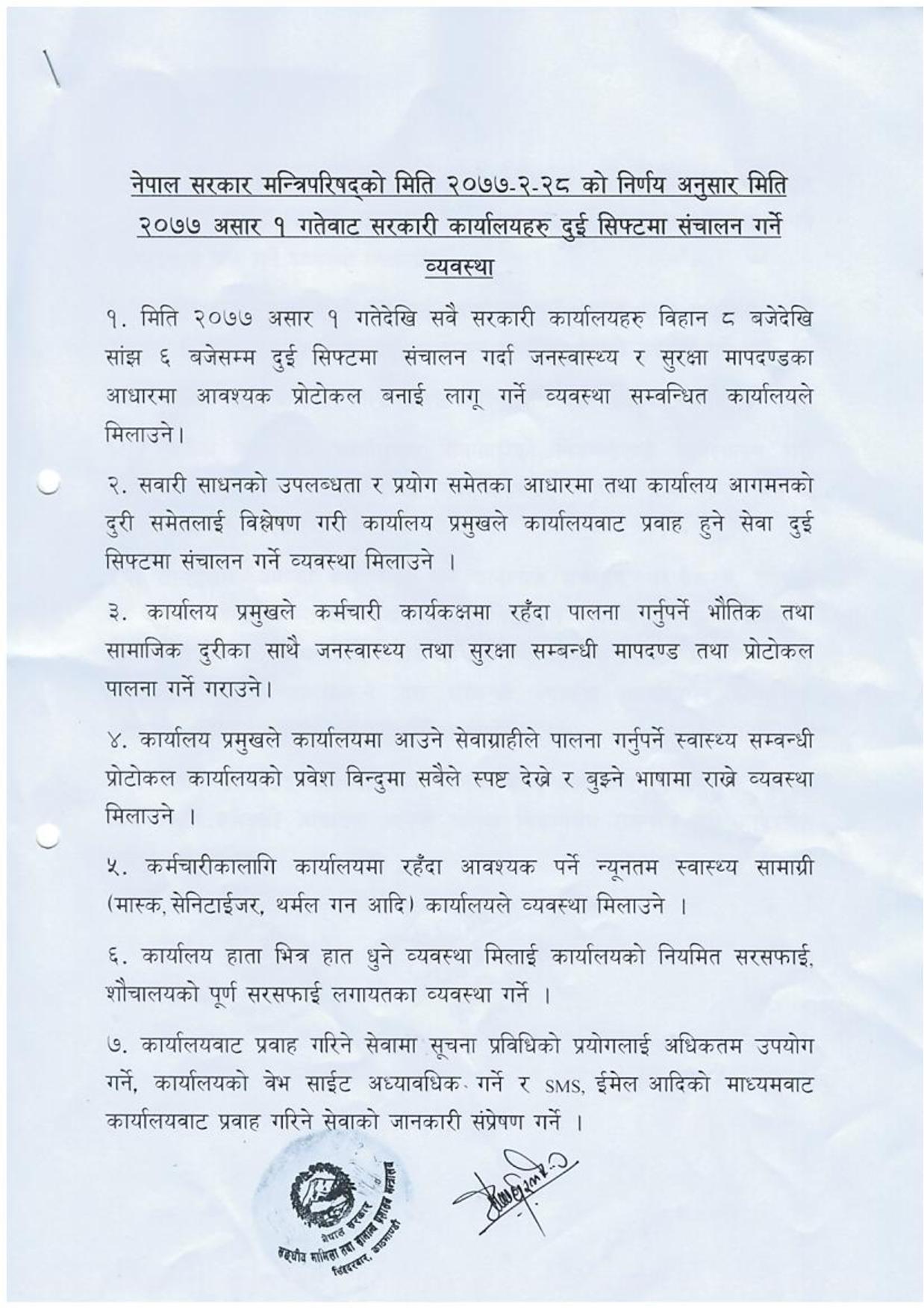 २८ जेठमा बसेको मन्त्रिपरिषद्को बैठकले बिहान ८ देखि साँझ ६ बजेसम्म दुई सिफ्ट गरेर सरकारी कार्यालय सञ्चालन गर्ने निर्णय गरेको थियो।