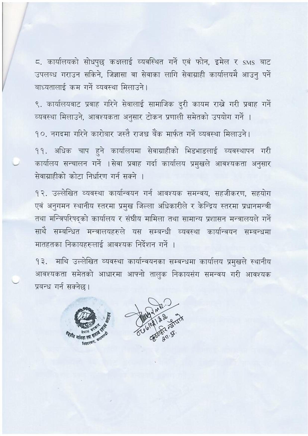 “भौतिक दूरी कायम गराउने, कार्यालयमा सेनिटाइजर, मास्क अनिवार्य, जस्ता मापदण्ड कार्यालयले मिलाउनुपर्छ”, उनले भने, “कार्यालय आउन-जान समस्या परेको खण्डमा समेत सरकारी सवारीलाई परिचालन गरिनेछ। निजी सवारी भएका कर्मचारीलाई आवश्यक तेलको व्यवस्था गरिनेछ।”