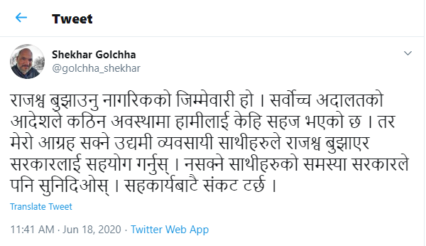 महासंघका वरिष्ठ उपाध्यक्ष शेखर गोल्छाले पनि ट्वीटरमार्फत् सम्पूर्ण व्यवसायीलाई कर तिर्न अपिल गरेका छन्।