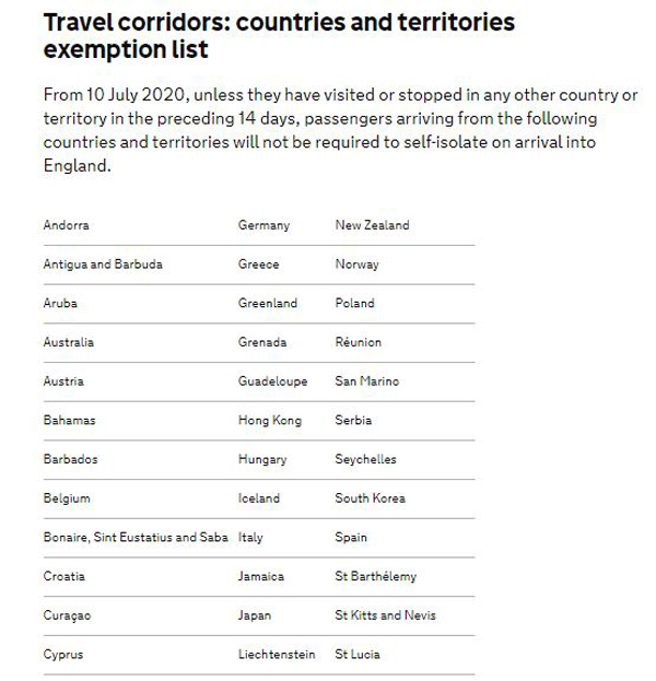 " /> काठमाडौं। इङ्ल्यान्ड प्रवेश गर्दा क्वारेन्टिनमा बस्नु नपर्ने मुलुकहरूको सूची प्रकाशित गरेको छ।शुक्रबार प्रकाशित सूचीमा ग्रीस, स्पेन, फ्रान्स, बेल्जियम, जर्मनी, डेनमार्क, अस्ट्रेलिया, हङकङ, नर्वे, दक्षिण कोरिया, जापानलगायत मुलुक परेका छन्।