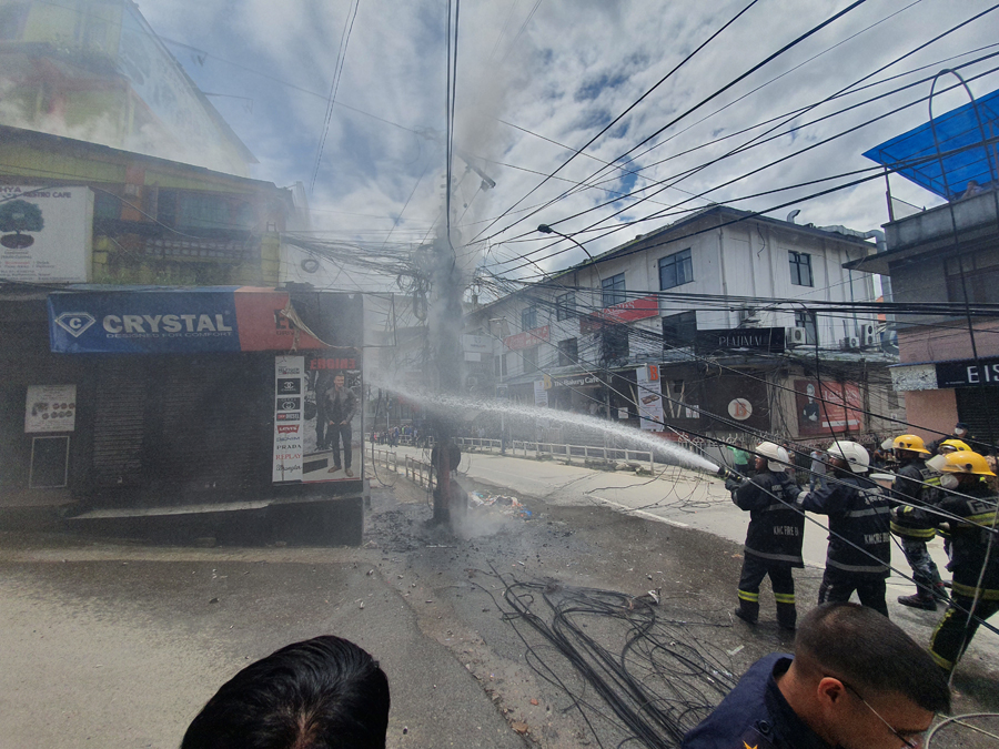 <p style="text-align: justify;">राइजिङ मल अगाडि विद्युत् सर्ट भई आज बिहान ११ः३० बजे आगलागी भएको हो। अव्यवस्थित रूपमा रहेका विद्युत् र टेलिफोनको तारमा आगलागी भएको प्रहरीले जनाएको छ। </p>