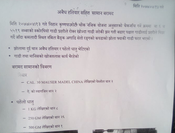 प्रहरीले आज बिहान कमलादीबाट दुई थान अवैध हतियार र पहेँलो धातु बरामद गरिएको थियो।