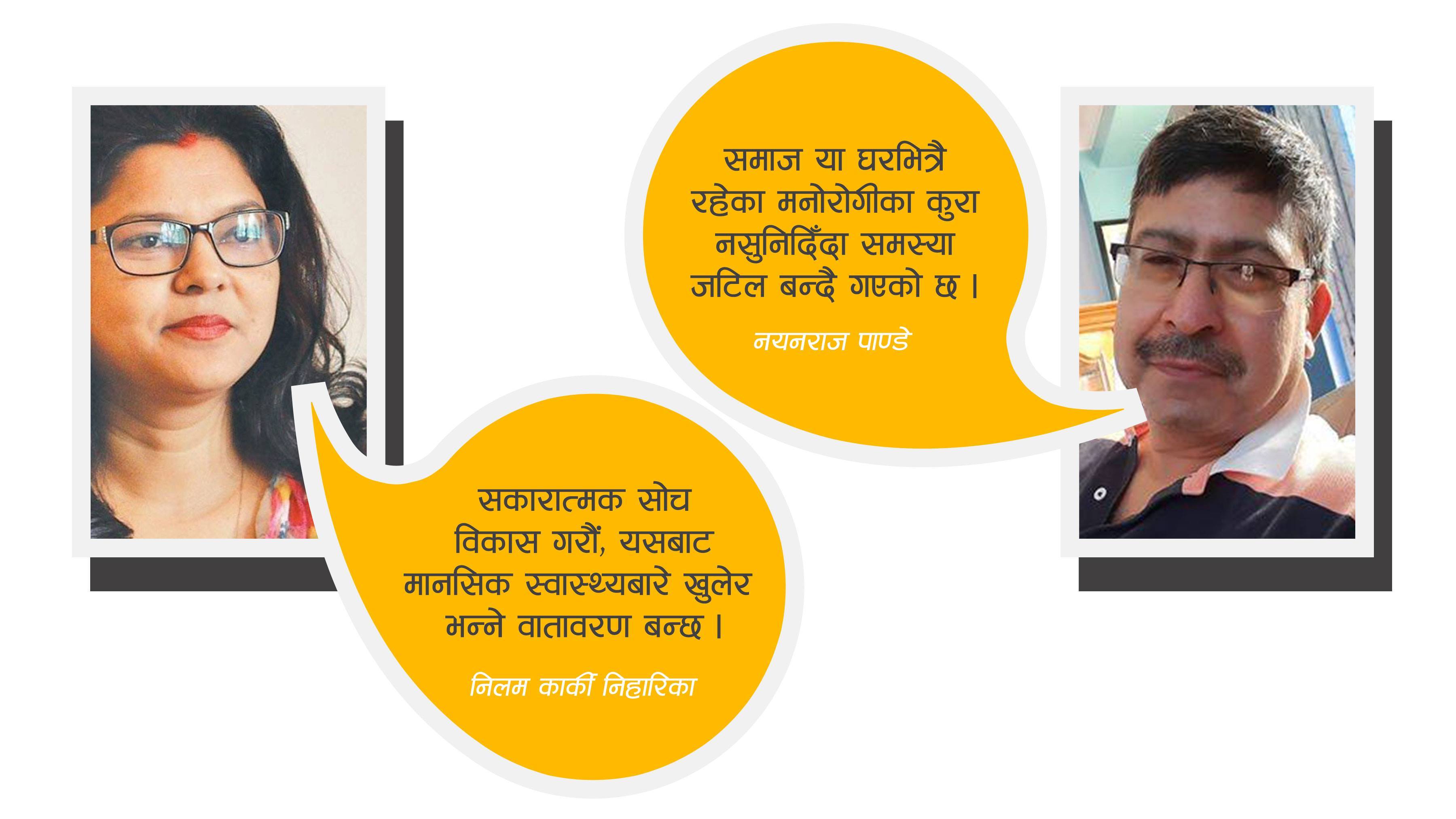 समाज या घरभित्रै रहेका मनोरोगीका कुरा नसुनिदिँदा समस्या जटिल बन्दै गएको बताउँछन् आख्यानकार नयनराज पाण्डे। ‘‘त्यस्ता रोग लागेका मानिसका कुरा सुन्ने र उनीहरूलाई जीवनप्रति आश्वस्त तथा सकारात्मक बन्न प्रेरित गर्नुपर्छ,’’ उनी भन्छन्, ‘‘यस्तो स्थितिमा उनीहरूलाई हामीले गुरु भएर अर्ति–उपदेश दिनेभन्दा मित्रवत् व्यवहार गर्नुपर्छ।’’