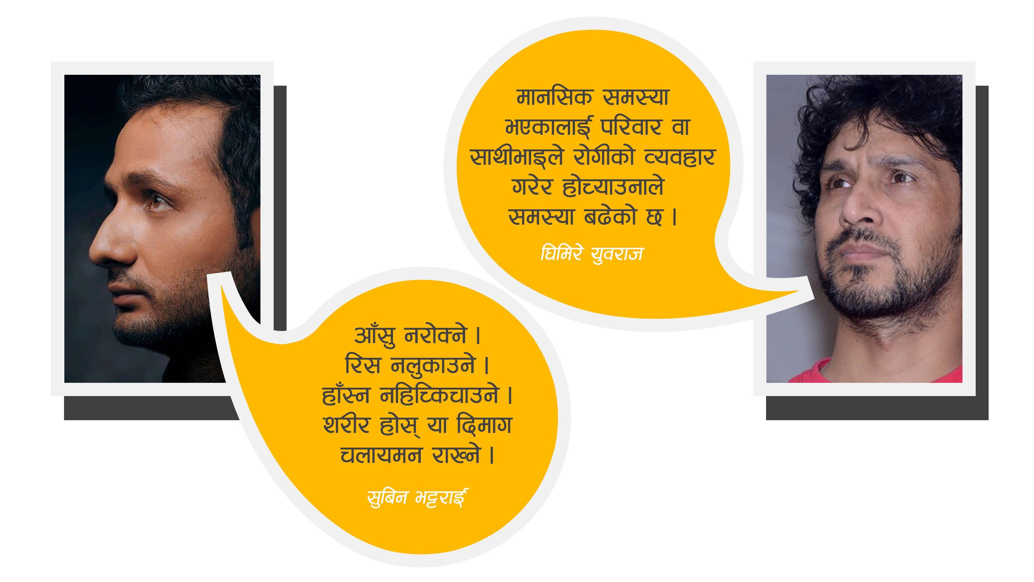 परिवार र साथीभाइले एकअर्कालाई बुझ्ने कोसिस नगर्दा समस्या दिनहुँ बढ्दै गएको बुझाइ छ लेखक तथा नाटक निर्देशक घिमिरे युवराजको। ‘‘मानसिक रोगीलाई निरुत्साहित गर्ने, हेप्ने गर्नु भएन। मानसिक समस्या भएकालाई परिवार वा साथीभाइले रोगीको व्यवहार गरेर होच्याउने गर्नाले समस्या बढेको छ,’’ उनी भन्छन्।