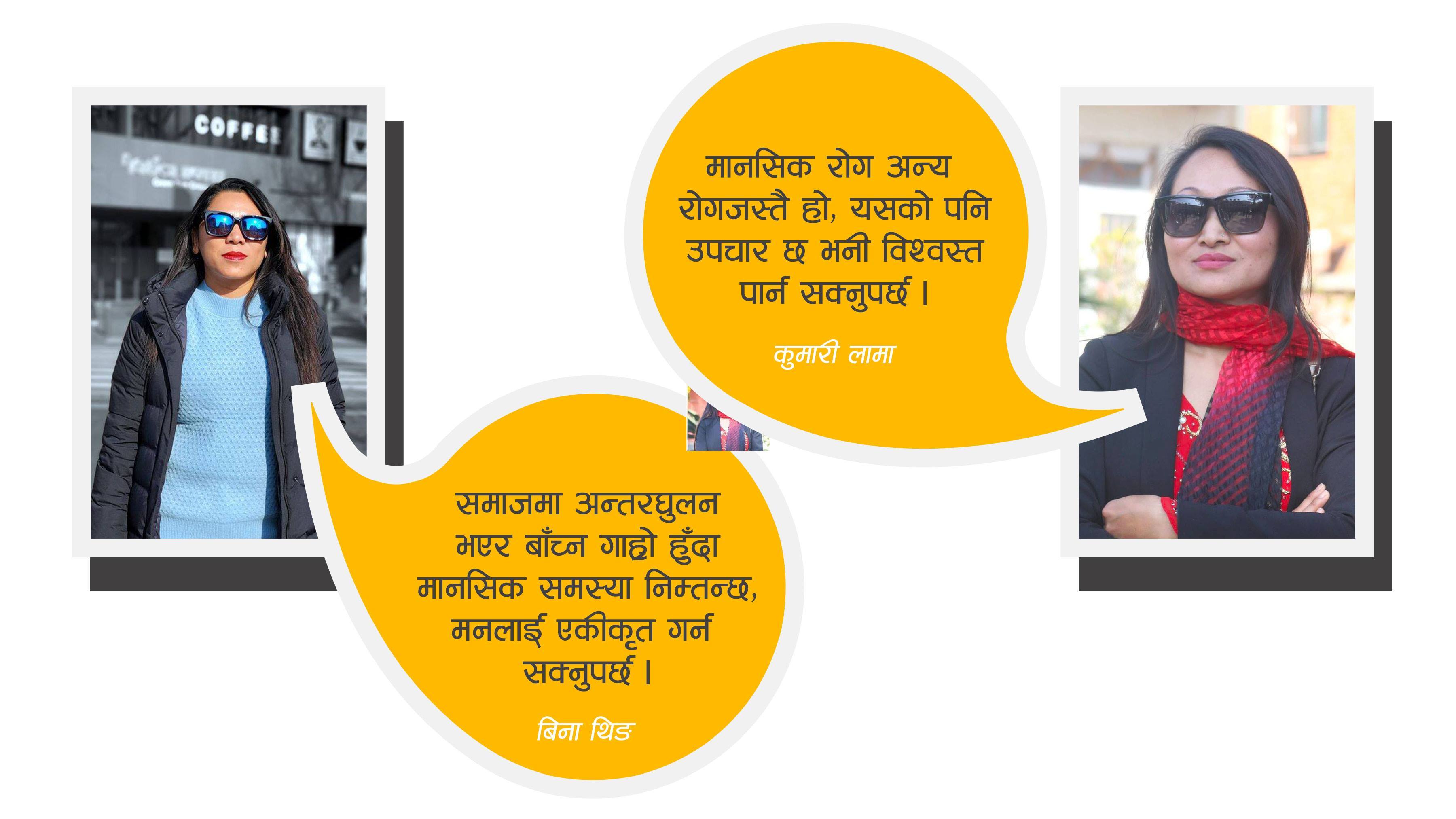मानसिक रूपमा स्वस्थ रहन शारीरिक तन्दुरुस्ती र सकारात्मक सोच आवश्यक पर्ने धारणा छ निबन्धकार तथा समालोचक कुमारी लामाको। ‘‘बिरामीलाई मानसिक रोग भनेको एकदमै सामान्य मनोगत अवस्था हो, यो जो कोहीलाई पनि हुन सक्छ साथै अन्य रोग जस्तै यसको पनि उपचार छ भनी विश्वस्त पार्न सक्नुपर्छ,’’ उनले भनिन्।