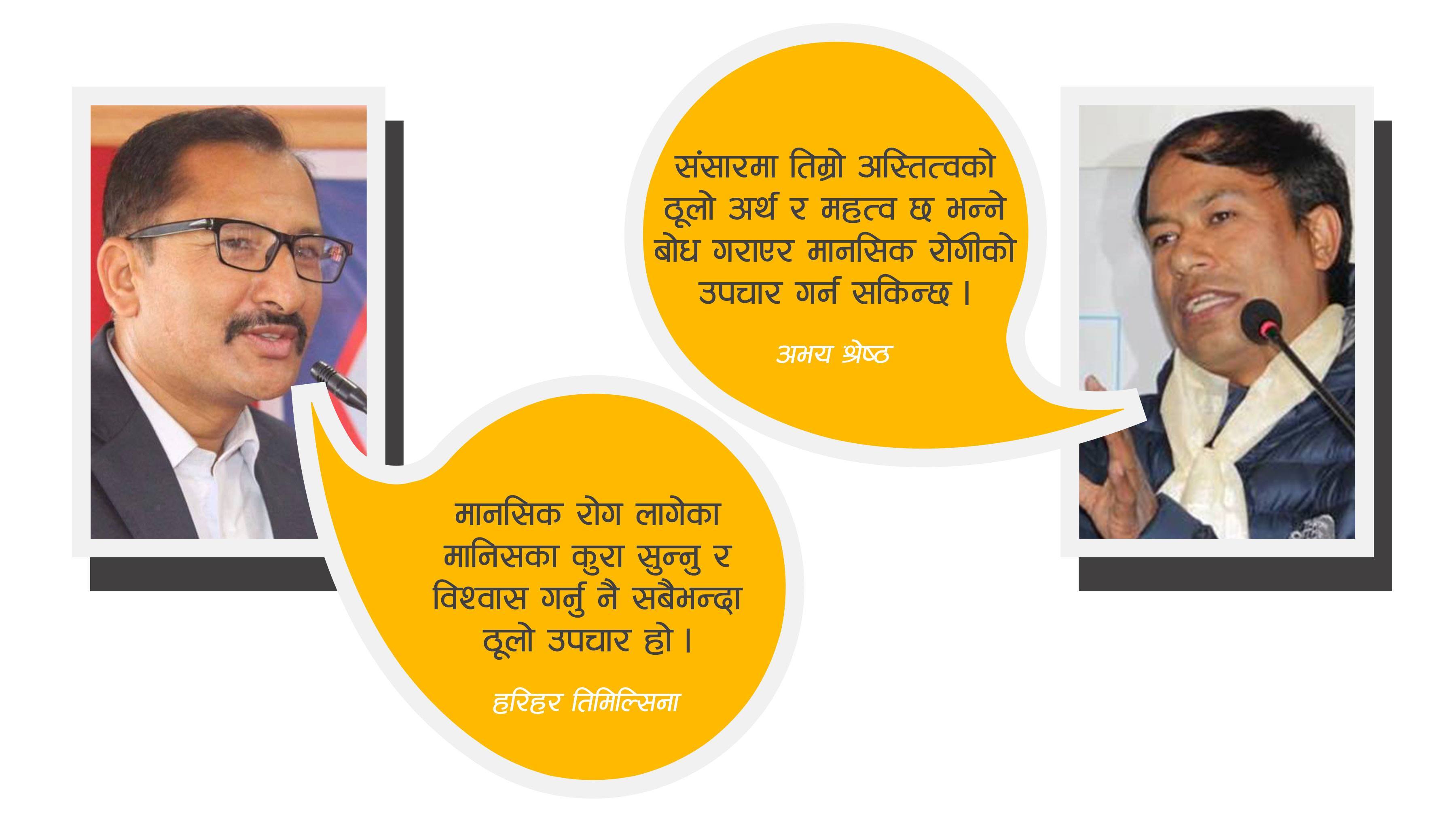 मुख्य कुरा मानसिक रोगका लक्षण भएका व्यक्तिका कुरा सुन्नुपर्ने कवि हरिहर तिमिल्सिनाको भनाइ छ। ‘‘कुरा सुन्नु र विश्वास गर्नु नै सबैभन्दा ठूलो उपचार हो,’’ उनी भन्छन्, ‘‘मानसिक समस्यामा परेका व्यक्तिको विश्वास जित्ने कोसिस गर्नुपर्छ। उसलाई मन पर्ने काम–कुरा गर्न रोकावट गर्नु हुँदैन।’’