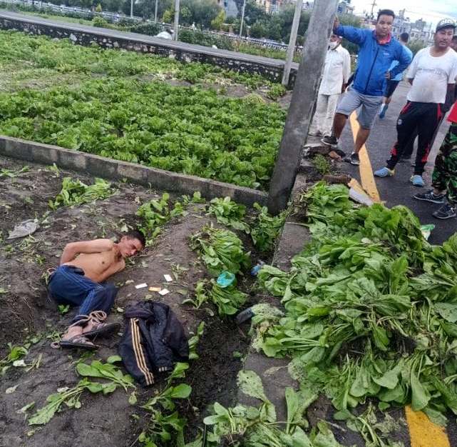 " /> भक्तपुर। आज बिहान चार बजे, मध्यपुर ठिमी नगरपालिका–२ स्थित दिव्यश्वरी प्लानिङमा साग चोरेको भनेर एक युवकलाई स्थानीयवासीले समाते। नजिकै रहेका एक पसेले साग चोर्दै गरेको देखेपछि उनलाई समातेका थिए। चोरीमा संलग्नलाई कानूनी कारबाहीका लागि प्रहरीमा बुझाउनुपर्ने हो तर, स्थानीयवासीले ती युवकलाई हात बाँधेर कुटपिट गरे। त्यसपछि उनलाई नजिकै रहेको बिजुलीको खम्बामा बाँधेर समेत कुटपिट गरे।घटनास्थल पुगेका प्रहरीले पनि न ती युवाको उद्धार गरे न स्थानीयलाई कुट्नबाट रोके। बिहान करीब साढे ६ बजेतिर घटनास्थलमा प्रहरी हवल्दार सी. लामा पुगेका थिए। ती हवल्दारले चोरीमा संलग्न रहेका भनिएका युवाको उद्धार गरेनन्। बाँधेर नराख्नसम्म भने। तर, उनकैसामु स्थानीयवासीले बिजुलीको खम्बामा दुवै हात उल्टो पारेर बाँधिदिए। प्रहरीकैसामु मुख र शरीरमा मुक्का हानिरहे।