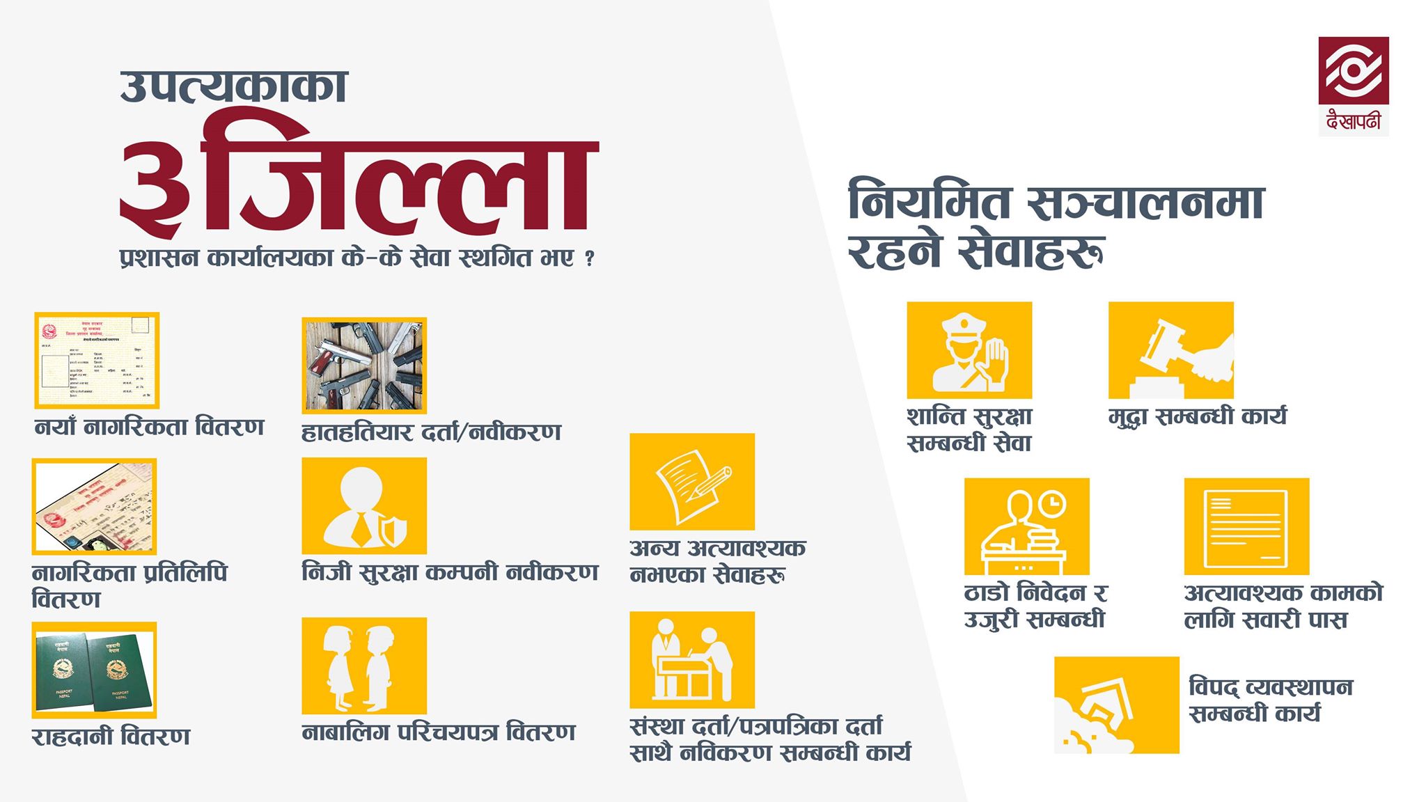 " /> काठमाडौं। काठमाडौं उपत्यकाका तीन वटै जिल्ला प्रशासन कार्यालयमा आजदेखि अत्यावश्यकबाहेकका सेवा बन्द गरिएको छ।लकडाउन खुलेसँगै कोरोना संक्रमितहरू बढ्न थालेपछि तीनवटै जिल्ला काठमाडौं, ललितपुर र भक्तपुरका सीडीओहरूको संयुक्त बैठकले ८ भदौसम्म लागू हुने गरी ती सेवा बन्द गर्ने निर्णय गरिसकेका छन्।