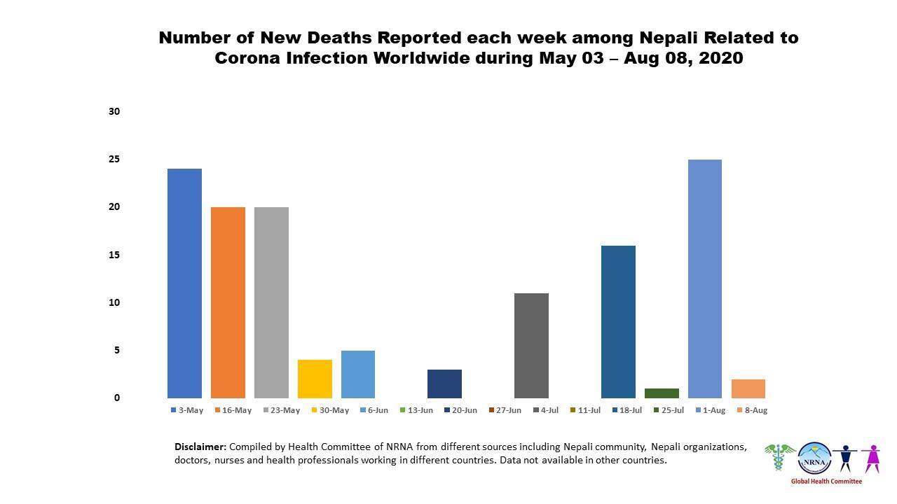कोरोना भाइरसका कारण बेलायत, युएई, साउदी अरब, बहराइन, कुवेत, कतार, आयरल्याण्ड, जापान, टर्की, नेदरल्याण्ड र स्वीडेन, भारत, नेपाल, साउथअफ्रीका लगायतका देशमा रहेका नेपालीहरूको ज्यान गएको छ।