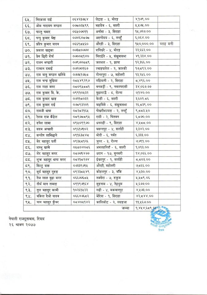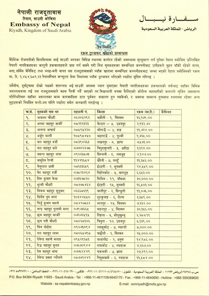 रियादस्थित नेपाली राजदूतावासद्वारा जारी विज्ञप्ति अनुसार विभिन्न स्थानमा कार्यरत रही रहँदा मृत्यु भएका नेपालीको कानूनी हकवालाहरूले प्राप्त गर्ने गरी उनीहरू कार्यरत कम्पनीबाट बुझ्न बाँकी तलब, भत्ता, सर्भिस बेनिफिट तथा ब्लड-मनी बापतको रकम राजदूतावासको बैंक खातामा जम्मा भएको जानकारी गराइएको छ।
