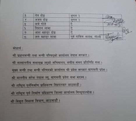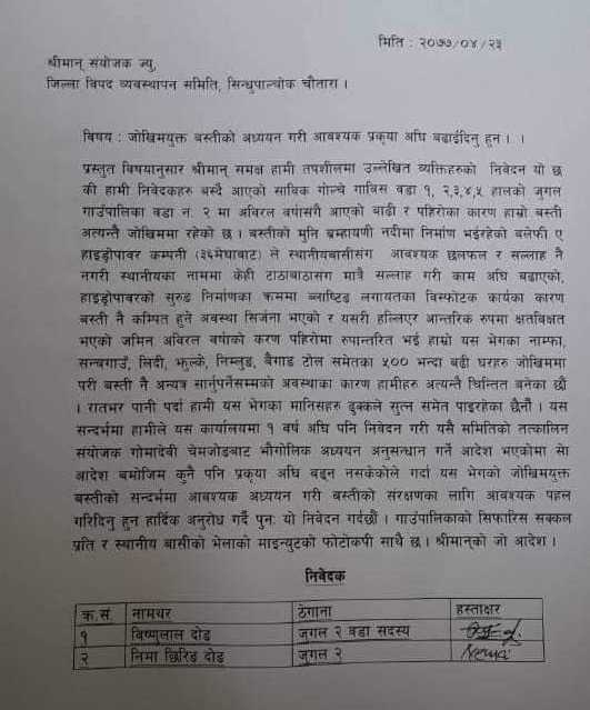 निवेदनमा थप भनिएको छ, ‘‘यस सन्दर्भमा हामीले त्यस कार्यालयमा एक वर्षअघि निवेदन दिएकोमा समितिको तत्कालीन संयोजक गोमादेवी चेमजोङबाट भौगोलिक अध्ययन गर्ने आदेश भएकोमा त्यस बमोजिम कुनै पनि प्रक्रिया अगाडि बढ्न नसकेकोले यस जोखिमयुक्त वस्तीको अध्ययन तथा संरक्षणका लागि आवश्यक पहल गरिदिनुहुन अनुरोध छ।’’