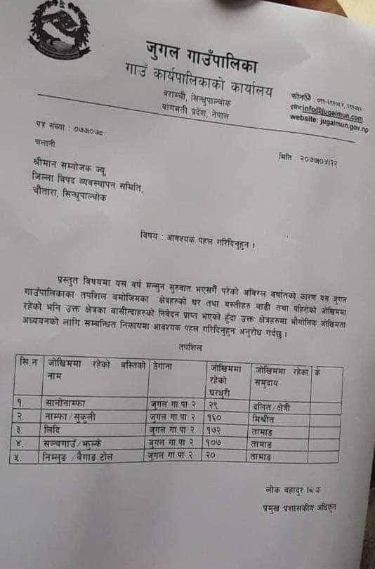 जुगल गाउँपालिकालेसमेत सानोनाम्फा, नाम्फा, सुकुली, लिदी, सञ्चगाउँ, झुल्के, निम्लुङ, बैगाङ टोललगायतका वस्ती पहिरोको जोखिममा रहेको उल्लेख गर्दै आवश्यक अध्ययनका लागि माग गरी जिल्ला विपद् व्यवस्थापन समितिलाई पत्राचार गरेको पाइएको छ। गाउँपालिकाको पत्र र स्थानीयको निवेदन प्राप्त भएपछि जिल्ला प्रशासन कार्यालय सिन्धुपाल्चोकले साउन २३ गते जिल्लास्थित भू तथा जलाधार कार्यालयलाई पत्र लेखेको देखिन्छ।