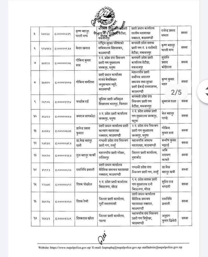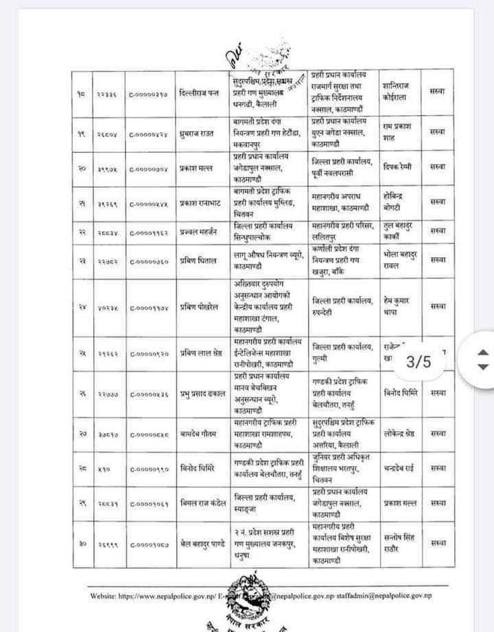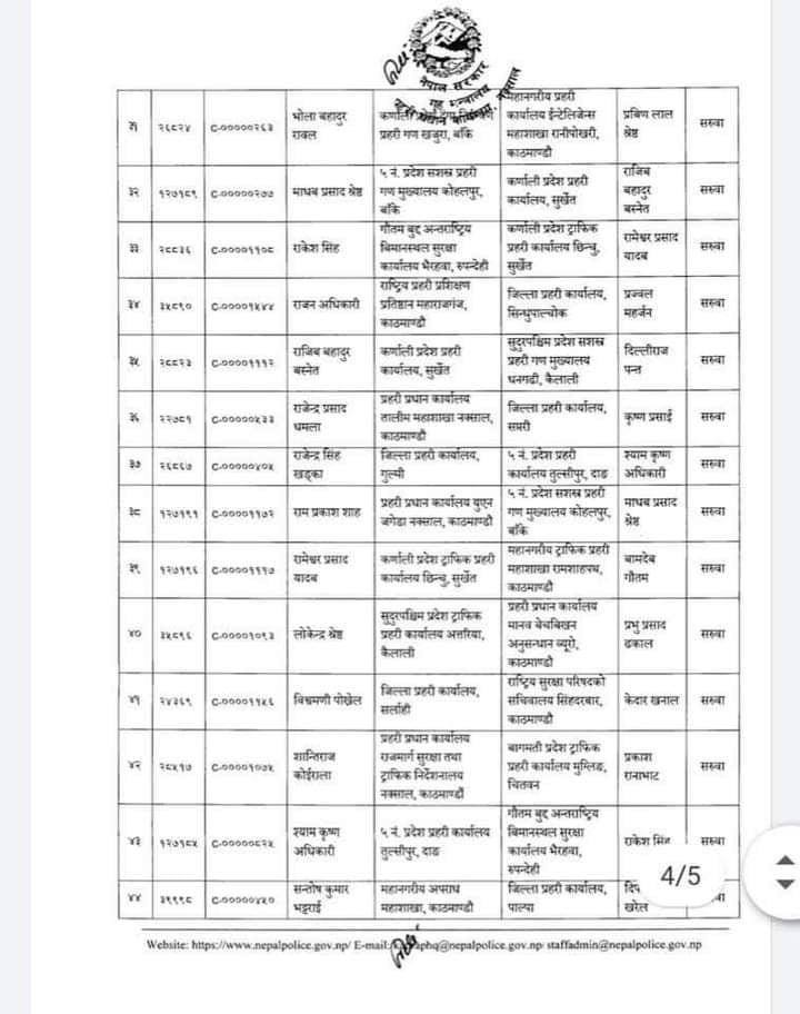 कृष्णकुमार महत लागूऔषध नियन्त्रण व्यूरो, कृष्ण प्रसाई २ नम्बर प्रदेश प्रहरी कार्यालय जनकपुर तथा कृष्णकुमार पल्ली मगर प्रहरी प्रधान कार्यालय तालिम महाशाखा नक्सालमा सरुवा भएका छन्।