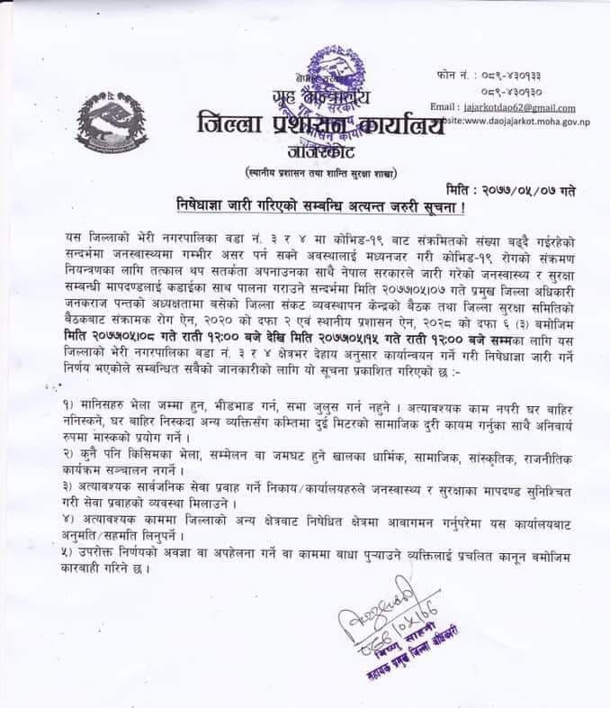 संक्रामक रोग ऐन, २०२० र स्थानीय प्रशासन ऐन २०२८ बमोजिम निषेधाज्ञा जारी गरिएको सहयाक प्रमुख जिल्ला अधिकारी साहनीले बताएका छन्। चौरजहारी प्रयोगशालामा गरिएको परीक्षणमा हिजो जाजरकोटका १९ जनामा कोरोना संक्रमण पुष्टि भएको छ।