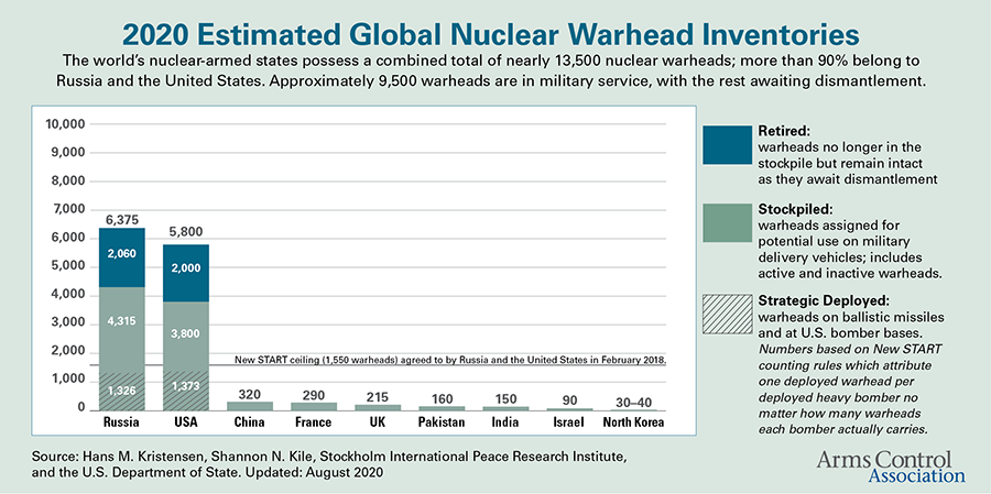 त्यस्तै छिमेकी देश भारतसँग १५०, पाकिस्तानसँग १६० र चीनसँग ३२० आणविक हतियार रहेको आर्मस्कन्ट्रोलले उल्लेख गरेको छ।