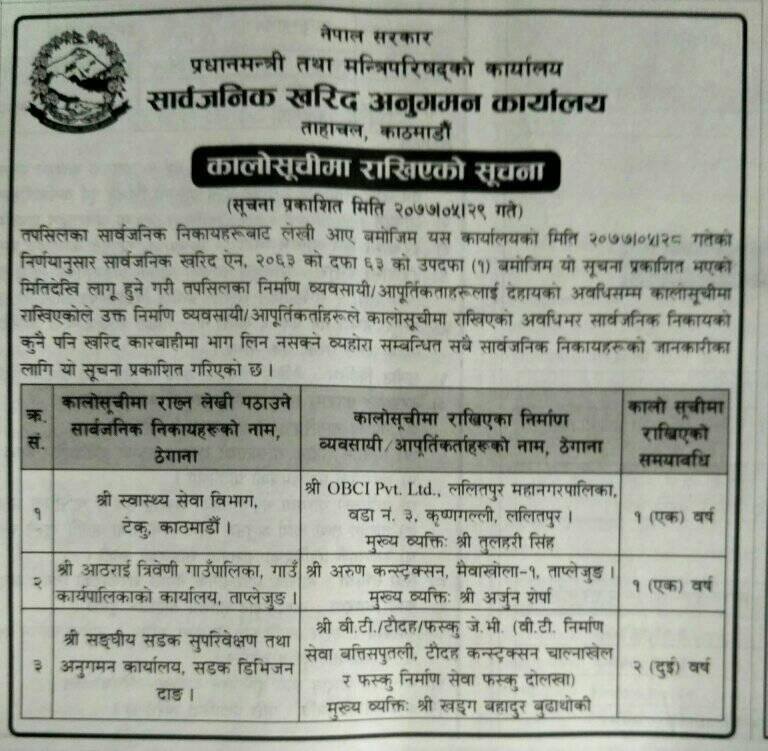 त्यसैगरी, बी.टी/टौदह/फस्कु जेभीलाई संंघीय सडक सुपरिवेक्षण तथा अनुगमन कार्यालय, सडक डिभिजन दाङको सिफारिसमा दुई वर्षको लागि कालोसूचीमा राखिएको सूचना सार्वजनिक खरिद अनुगमनको कार्यालयले प्रकाशन गरेको छ।