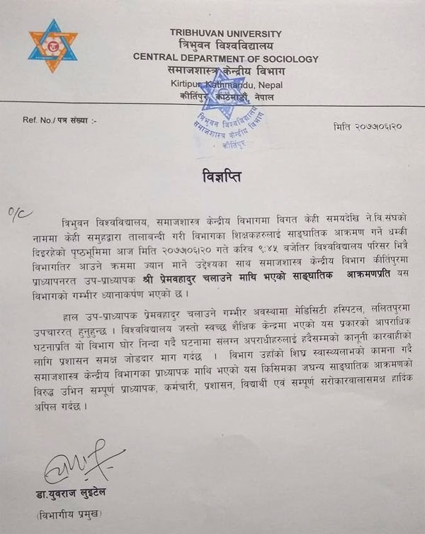 त्रिभुवन विश्वविद्यालयको समाजशास्त्र केन्द्रीय विभागले उपप्राध्यापक प्रेमबहादुर चलाउनेमाथि भएको आक्रमणप्रति आफ्नो गम्भीर ध्यानाकर्षण भएको जनाएको छ।