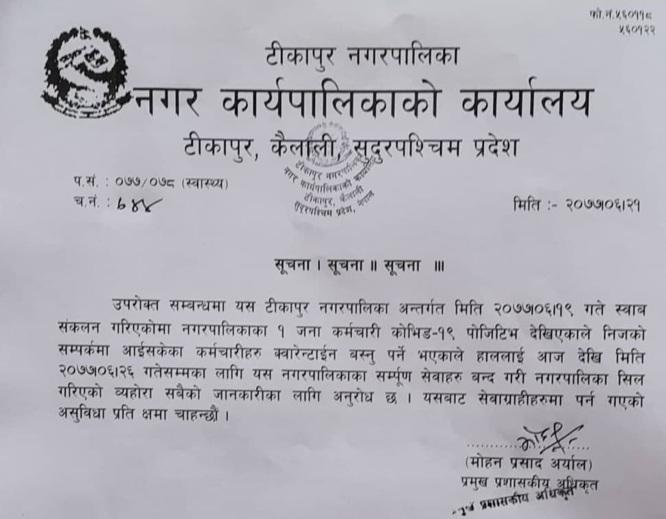 नगरपालिकाका प्रमुख प्रशासकीय अधिकृत मोहनप्रसाद अर्यालले आज एक सूचना जारी गर्दै कोरोना सङ्क्रमितको सम्पर्कमा आएका सबै कर्मचारीहरू क्वारेन्टाइन बस्नुपर्ने भएकाले सिल गरिएको बताएका छन्। सूचनामा उल्लेख भएअनुसार असोज २६ गतेसम्म नगरपालिकाका सम्पूर्ण सेवाहरू बन्द रहनेछन्।