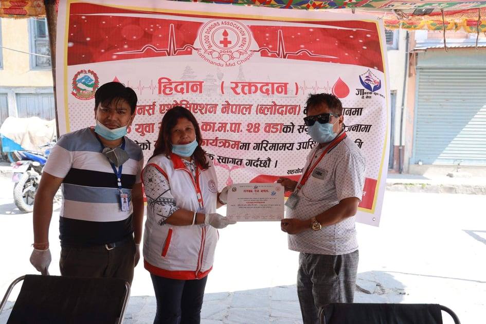 काठमाडौँ। ब्लड डोनर्स एसोसिएसन नेपाल (ब्लोदान)को आह्वानमा जागरुक युवा समाजले काठमाडौँमा चौथो पटक रक्तदान कार्यक्रमको आयोजना गरेको छ। समाजले काठमाडौं महानगरपालिका–२४ वडा कार्यालयसँगको संयुक्त आयोजनामा काठमाडौंको इतुम्बहालमा रक्तदान कार्यक्रम गरेको हो ।