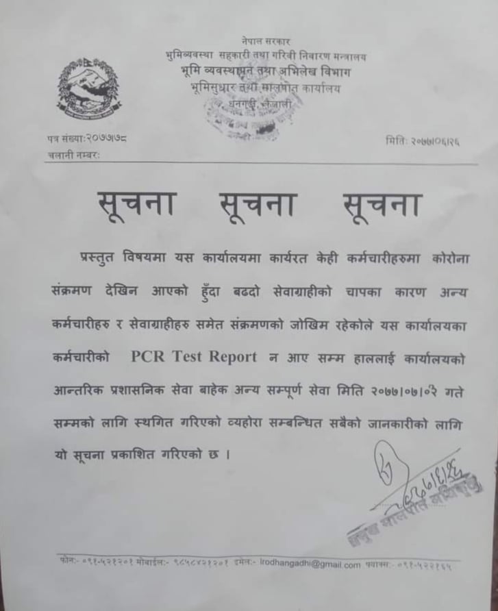 भूमि सुधार तथा मालपोत कार्यालय कैलालीमा कर्मचारीलाई कोरोना पुष्टि भएपछि कार्यालय बन्द गरिएको छ।