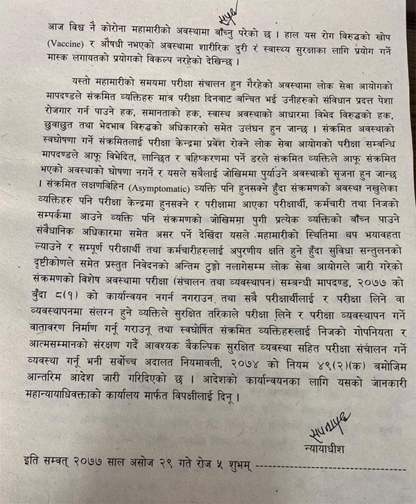 यससँगै आदेशमा “सबै परीक्षार्थीलाई र परीक्षा लिने वा व्यवस्थापनमा संलग्न हुने व्यक्तिले सुरक्षित तरिकाले परीक्षा लिने र परीक्षा व्यवस्थापन गर्ने वातावरण निर्माण गर्नु गराउनु तथा स्वाघोषित संक्रमित व्यक्तिहरूलाई निजको गोपनीयता र आत्मसम्मानको संरक्षण गर्दै आवश्यक वैकल्पिक सुरक्षित व्यवस्थासहित परीक्षा सञ्चालन गर्ने व्यवस्था गर्नू गराउनू,” भनिएको छ।