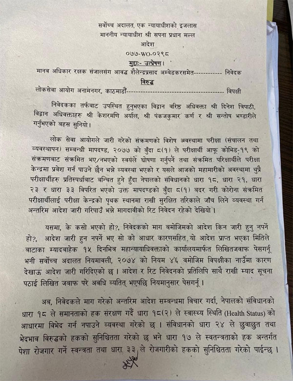 आदेशमा संक्रमित अवस्थाको स्वघोषणा गर्ने संक्रमितलाई परीक्षा केन्द्रमा प्रवेश रोक्ने लोक सेवा आयोगको परीक्षासम्बन्धी मापदण्डले आफू विभेदित, लान्छित र वहिष्करणमा पर्ने डरले संक्रमित व्यक्तिले आफू संक्रमित भएको अवस्थाको घोषणा गर्ने र यसले सबैलाई जोखिममा पुर्याउने अवस्थाको सिर्जना हुन जाने भनिएको छ।