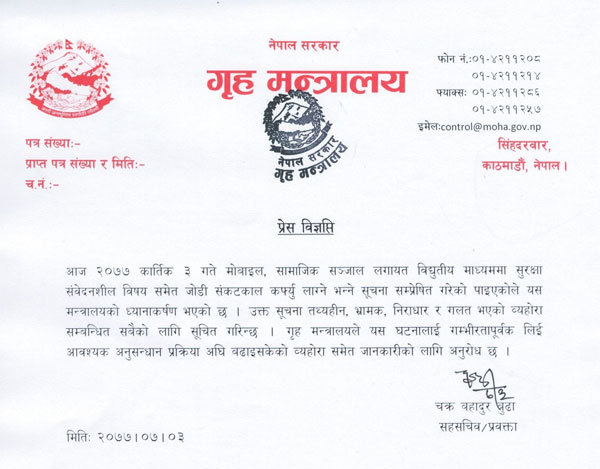 <p style="text-align: justify;">मन्त्रालयले आज एक विज्ञप्ति जारी गरी मोबाइल, सामाजिक सञ्जाललगायत विद्युतीय माध्यममा सुरक्षा संवेदनशील विषयसमेत जोडेर सङ्‍कटकाल र कर्फ्यु लाग्ने भन्ने सूचना सम्प्रेषण गरेको पाइएकाले गम्भीर ध्यानाकर्षण भएकोसमेत जनाएको छ।</p>