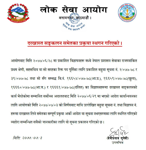 ‘‘आयोगबाट मिति २०७७/०६/२८ मा प्रकाशित विज्ञापनहरूमध्ये नेपाल प्रशासन सेवाका राजपत्रांकित प्रथम श्रेणी, सहसचिव वा सो सरहका रिक्त पद पूर्तिका लागि प्रकाशित बढुवा सूचना नं. २/०७७/३९/०७७-७८ तथा सोसँग सम्बद्ध वि.नं. १६६५४/०७७-७८ (आ.प्र.), १६६५९/०७७-७८ (खुला), १६६६०/०७७-७८ (आ.ज.) र १६६६१/०७७-७८ (दलित) का विज्ञापनहरूमा दरखास्त संकलनको काम भइरहेकोमा सम्मानित सर्वोच्च अदालतबाट मिति २०७७/०६/२९ मा भएको आदेश कार्यान्वयनका लागि आयोगको मिति २०७७/०७/०३ को निर्णयबाट माथि उल्लेखित बढुवा सूचना नं. तथा विज्ञापन नं. हरूमा दरखास्त लिनेसमेतका सम्पूर्ण प्रक्रिया अर्को आदेश वा सूचना नभएसम्मका लागि स्थगित गरिएको जानकारी गराइन्छ,’’ आयोगद्धारा जारी विज्ञप्तिमा उल्लेख छ।
