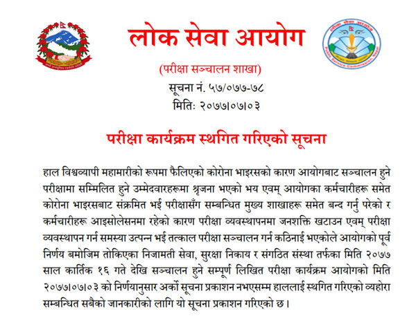 आयोगबाट सञ्चालन हुने परीक्षामा सम्मिलित हुने परीक्षार्थीहरूमा सिर्जना भएको एवं आयोगका कर्मचारीहरूसमेत कोरोना भाइरसबाट संक्रमित भई परीक्षासँग सम्बन्धित मुख्य शाखाहरू बन्द गर्नु परेको तथा कर्मचारीहरू आइसोलेसनमा रहेको कारण जनशक्ति खटाउन एवं परीक्षा व्यवस्थापनमा समस्था उत्पन्न हुने जनाउँदै कात्तिक १६ गतेदेखि सञ्चालन हुने परीक्षा स्थगित गर्ने निर्णय गरेको आयाेगले जनाएको छ।
