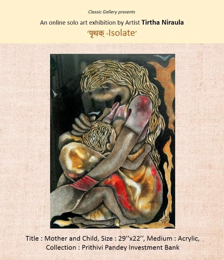 सोलो एक्जिबेशनमा ‘पृथक’ नाम दिइएको छ। “यो आर्टले खासमा लकडाउन तथा कोरोना महामारीको अवस्थामा आर्टिस्टहरूलाई आफ्नो कला प्रस्तुत गर्ने राम्रो मौका मिल्यो। त्यसक्रममा बनेका कामहरू पनि छन्”, उनी भन्छन्।
