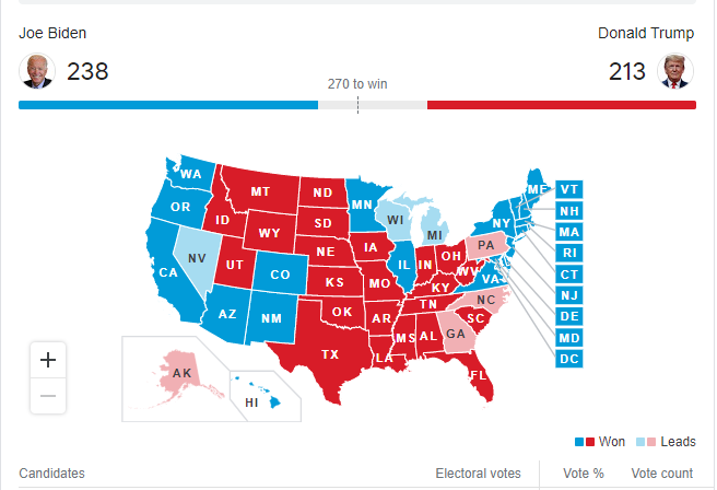 यसअघि नै २३८ भोट ल्याइसकेका बाइडेनले यी स्थानमा जिते राष्ट्रपति बन्नका लागि आवश्यक २७० मत प्राप्त गर्नेछन्। हालसम्म २१३ इलेक्टोरल भोट ल्याइसकेका ट्रम्पले अहिले चार राज्यमा गरी अग्रता लिइरहेको ५४ भोट ल्याए पनि २६७ मात्रै हुनेछ।