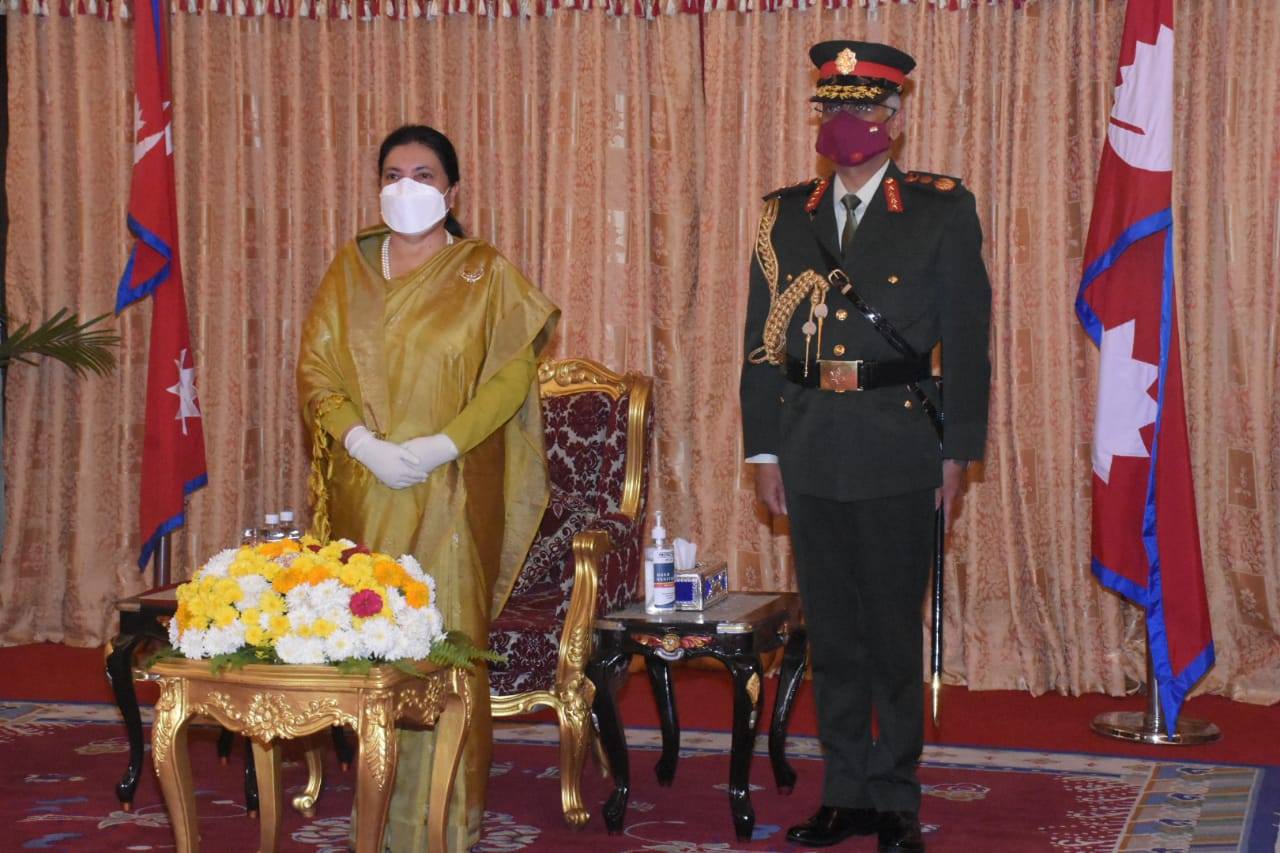 " /> काठमाडौं। राष्ट्रपति विद्यादेवी भण्डारीले नेपाल भ्रमणमा रहेका भारतीय स्थल सेनाध्यक्ष मनोज मुकुन्द नरवणेलाई नेपाली सेनाको मानार्थ महारथी पदवी प्रदान गरेकी छन्।राष्ट्रपति कार्यालय शितल निवासमा आज एक कार्यक्रमको आयोजना गरी नरवणेलाई उनले नेपाली सेनाको मानार्थ महारथी पदवीले सम्मान गरेकी हुन्।