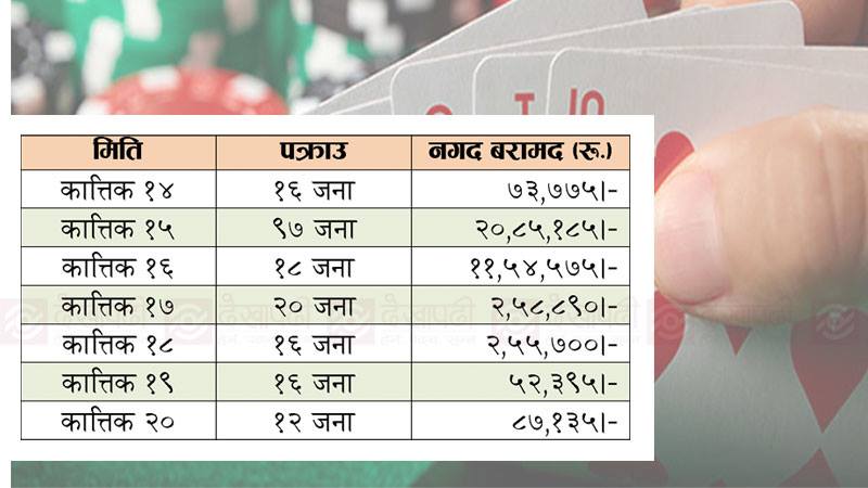 कानुनविपरीतको जुवातास खेल्ने कार्य चाडबाडमा बढी हुने सम्भावनालाई ध्यान दिँदै प्रहरीले सुरक्षा योजनामा समावेश गरेरै जुवातास खेल्ने र खेलाउनेहरूलाई धमाधम पक्राउ गर्दै आएको छ।