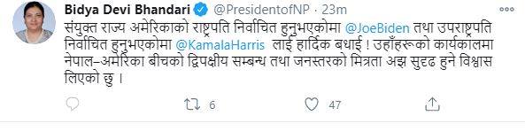“संयुक्त राज्य अमेरिकाको राष्ट्रपति निर्वाचित हुनुभएकोमा जो बाइडेन तथा उपराष्ट्रपति निर्वाचित हुनुभएकोमा कमला हयारिसलाई हार्दिक बधाई,” राष्ट्रपति भण्डारीले आज ट्वीटर मार्फत भनेकी छन्।