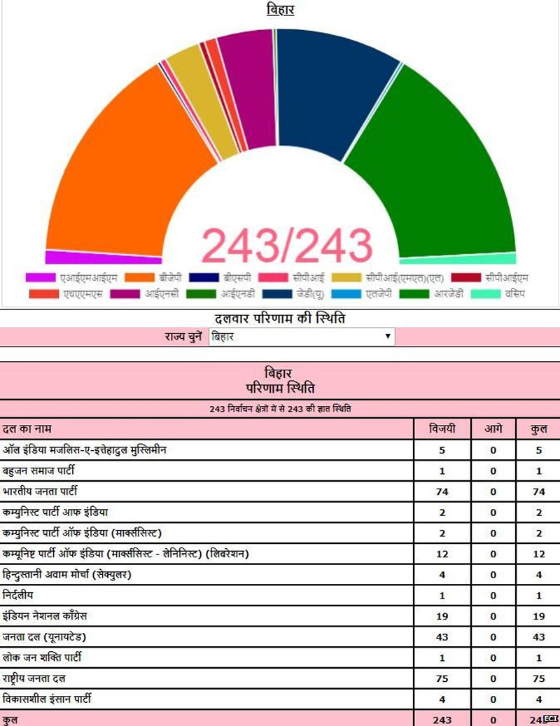 <p style="text-align: justify;">निर्वाचन आयोगबाट प्राप्त जानकारी अनुसार सत्तारूढ एनडीए गठबन्धनमा सामेल बीजेपीले ७४ सिट, जेडीयूले ४३, विकासशील इंसान पार्टी (भीआईपी)ले चार तथा हिन्दुस्तान अवाम मोर्चाले चार सिट प्राप्त गरेका छन्।</p>