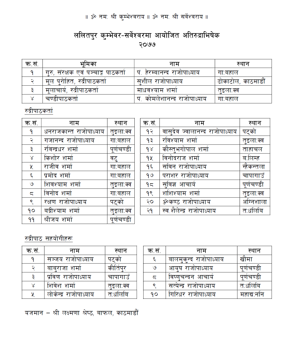 ललितपुरका राजोपाध्याय ब्राह्मणहरूको तत्त्वधानमा गरिएको उक्त ऐतिहासिक कर्मसँगै मेरा ससुरा बुवा पं. हेरम्बानन्द राजोपाध्यायले अर्को धार्मिक अनुष्ठानको कुरा निकाल्नुभयो, पाटनको कुम्भेश्वर-सर्वेश्वर मन्दिरमा अतिरुद्राभिषेक।