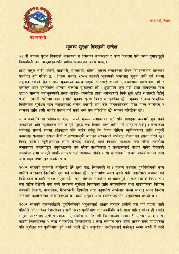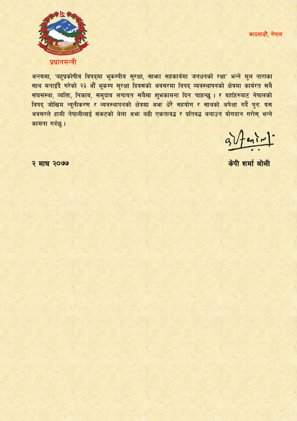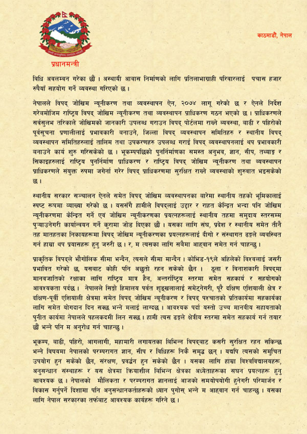 ‘‘यहाँहरूबाट नेपालको विपद् जोखिम न्यूनीकरण र व्यवस्थापनको क्षेत्रमा अझ धेरै सहयोग र साथको अपेक्षा गर्दै पुनः यस अवसरले हामी नेपालीलाई संकटको बेला अझ बढी एकताबद्ध र प्रतिबद्ध बनाउन योगदान गरोस् भन्ने कामना गर्दछु,’’ प्रधानमन्त्रीको सन्देशमा उल्लेख छ।