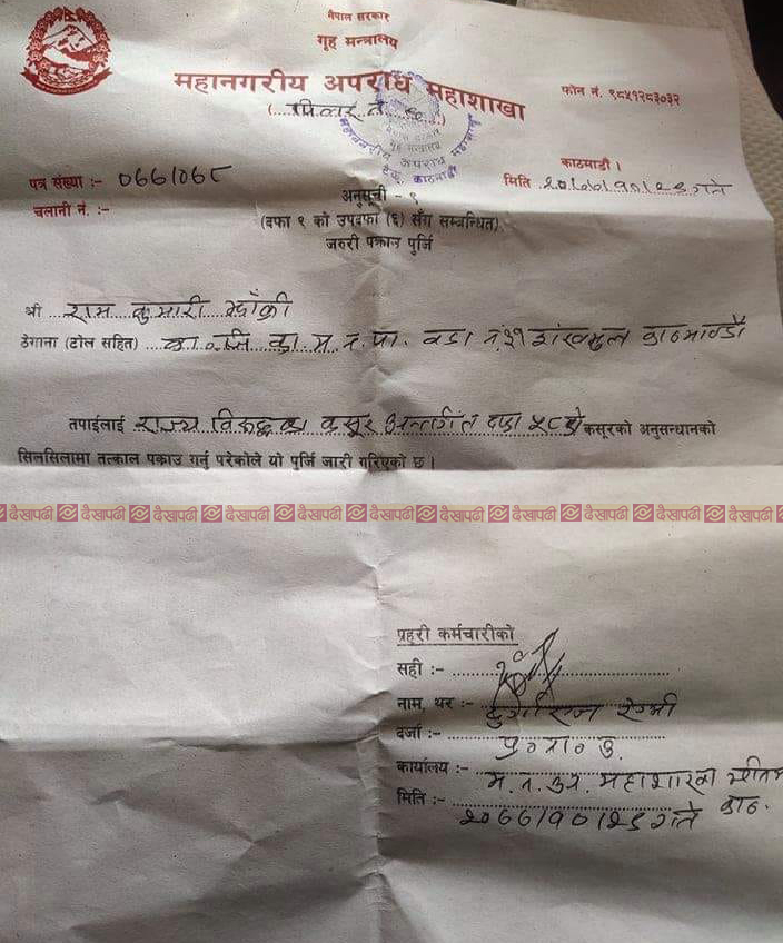 ‘मुलुकी अपराध संहिता २०७४’को दफा ५८ अनुसार प्रहरीले पक्राउ पुर्जी उनीविरुद्ध जारी गरेपछि उनले गिरफ्तारी दिएकी हुन्।
