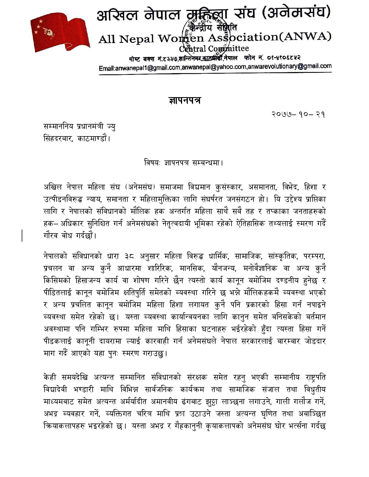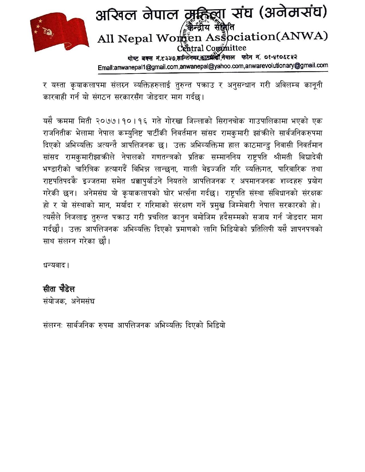 उक्त अभिव्यक्तिमा हाल काठमाडौं निवासी निवर्तमान सांसद् रामकुमारी झाँक्रीले नेपालको गणतन्त्रको प्रतीक सम्माननीय राष्ट्रपति श्रीमती विद्यादेवी भण्डारीको चारित्रिक हत्या गर्दै विभिन्न लाञ्छना, गाली बेइज्जती गरी व्यक्तिगत, पारिवारिक तथा राष्ट्रपति पदकै इज्जतमासमेत धक्का पुर्याउने नियतले आपत्तिजनक र अपमानजनक शब्दहरू प्रयोग गरेकी छन्। अनेमसंघ यो क्रियाकलापको घोर भर्त्सना गर्दछ। राष्ट्रपति संस्था संविधानको संरक्षक हो र यो संस्थाको मान, मर्यादा र गरिमाको संरक्षण गर्ने प्रमुख जिम्मेवारी नेपाल सरकारको हो। त्यसैले निजलाइ तुरुन्त पक्राउ गरी प्रचलित कानुनबमोजिम हदैसम्मको सजाय गर्न जोडदार माग गर्दछौं। उक्त आपत्तिजनक अभिव्यक्ति दिएको प्रमाणको लागि भिडियोको प्रतिलिपि यसै ज्ञापनपत्रको साथ संलग्न गरेका छौं।
